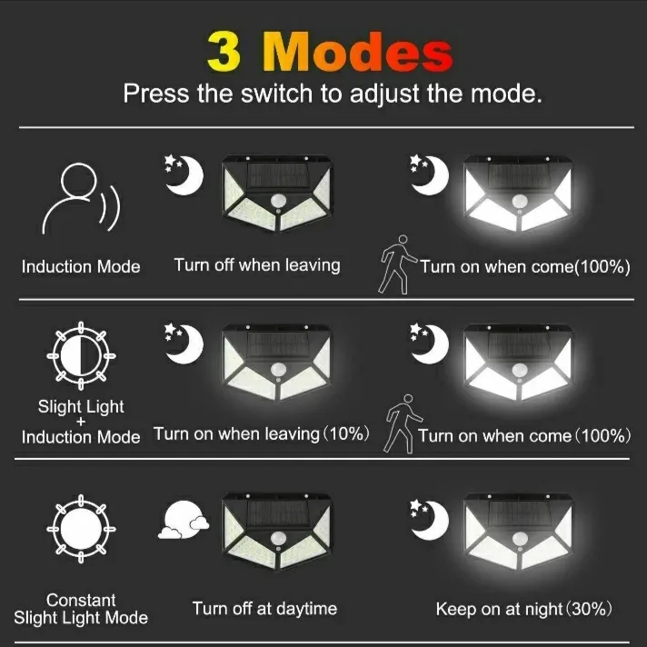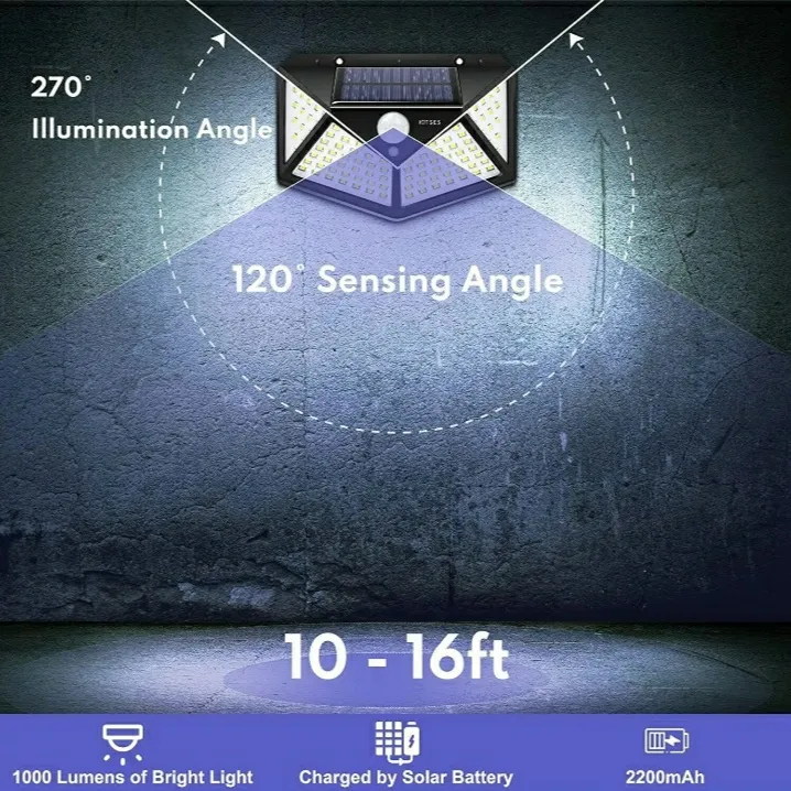 This upgraded Solar Motion Sensor Outdoor Lights is equipped with 100 high-power LED beads so that the brightness can reach 700 lumens, it has a 270° wide-angle lighting angle, three light modes collocation a very sensitive sensor to meet most of our lighting needs.